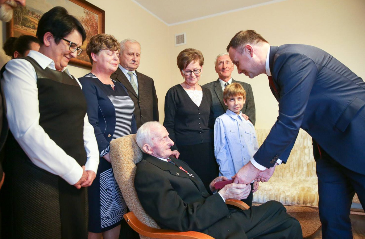 Prezydent wręczył odznaczenie podczas wizyty w domu Jana Szymańskiego.
