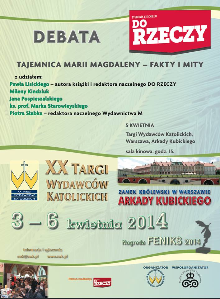 Szczególnie gorąco zapraszamy na debatę "Tajemnica Marii Magdaleny - fakty i mity", która rozpocznie w sali kinowej o godz. 15.00. W dyskusji wezmą udział Paweł Lisicki, Milena Kindziuk, Jan Pospieszalski, ks. prof. Marek Starowieyski i Piotr Słabka.