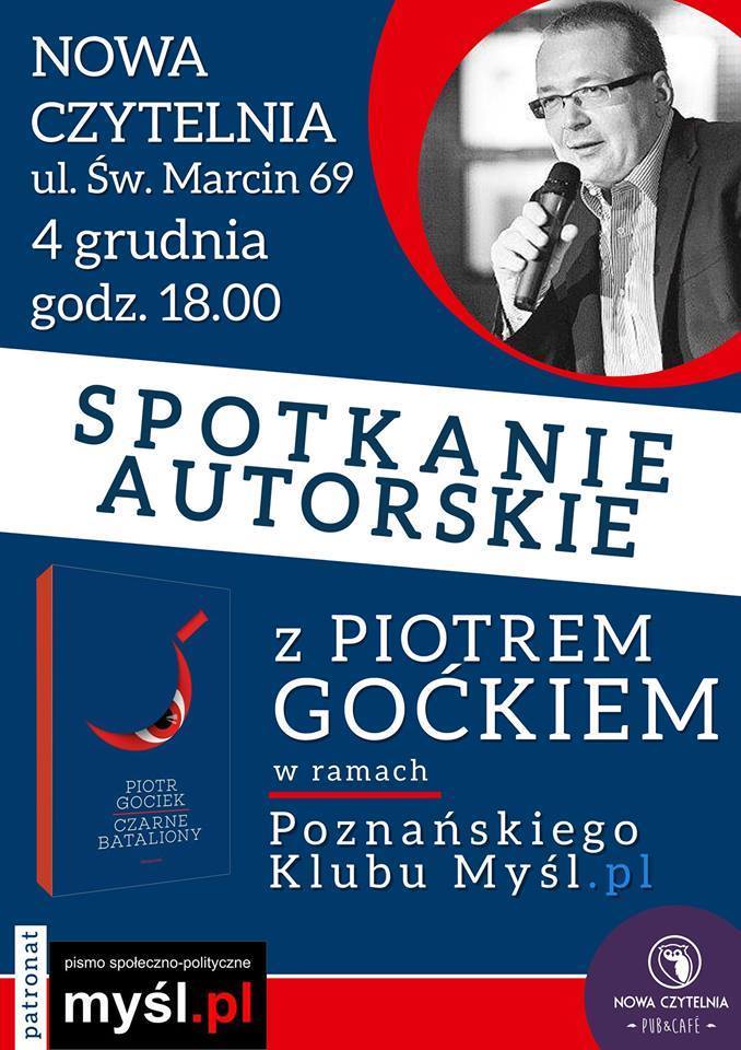 4 grudnia 2014 r. w Nowej Czytelnii przy ulicy św. Marcina 69 w Poznaniu odbędzie się spotkanie w ramach poznańskiego Klubu Myśl.pl. Gościem będzie autor "Czarnych batalionów", Piotr Gociek.