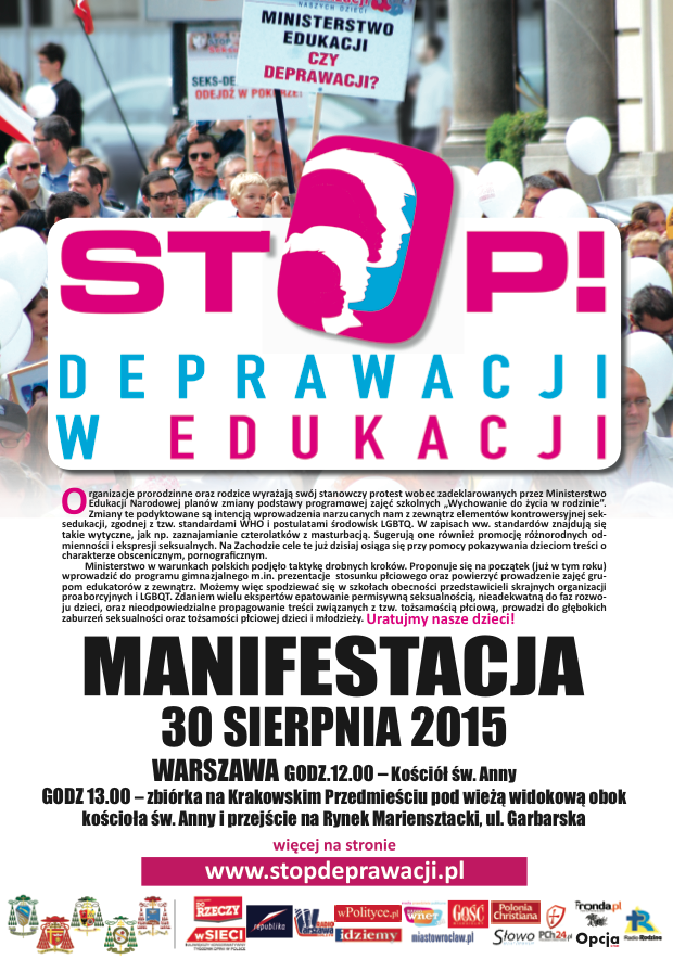 Zapraszamy rodziców, nauczycieli i młodzież do wzięcie udziału w manifestacji "Stop deprawacji w edukacji", która odbędzie się na Placu Zamkowym w Warszawie 30 sierpnia o godz. 13.00.